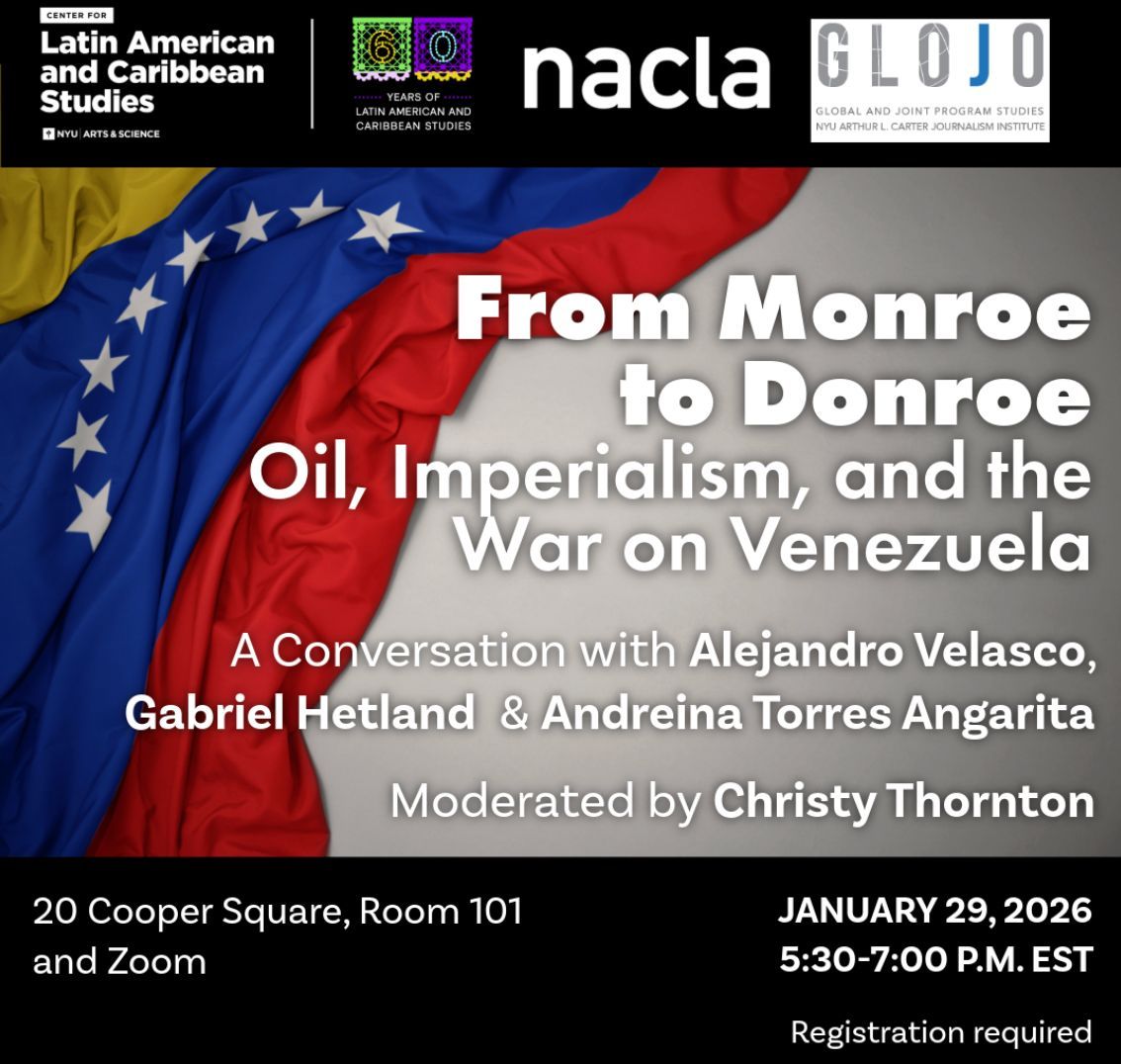 Join CLACS, NACLA, and NYU Global Journalism for a conversation on the crisis in Venezuela. This event is open to the public both in person and via Zoom. Please register in advance; note that physical seating is limited.