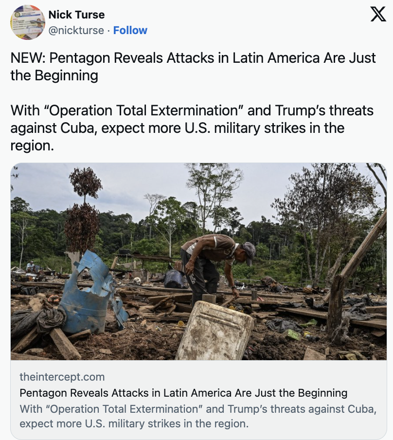 DETAILS ON U.S.-ECUADOR STRIKE—A U.S.-backed Ecuadorian anti-narcotics operation, which included the first public instance of the Trump administration “bombing Narco Terrorists on land,” targeted farmers with no ties to organized crime. According to residents of San Martín, a village along the border with Colombia, the joint mission known as “Operation Total Extermination” did not bomb an armed group “encampment,” but rather the homes of farmers. The March 6 bombing, publicly touted by the Trump administration, was the culmination of a nearly week-long operation in which Ecuadorian troops terrorized local residents. Soldiers allegedly burned the homes of local farmers, dropped more bombs in the area, and abducted four workers who were accused of being guerrilla fighters, subjected to torture, and told they would be killed if they spoke out. The operation was carried out the same week that the Trump administration implored Latin American leaders to rely more heavily upon military force to battle the region’s criminal organizations—and threatened to do so without their approval if collaboration faltered. The mission was heralded as a model of U.S.-backed land strikes against alleged criminal organizations, a tactic that is reportedly set to expand widely in the months ahead.