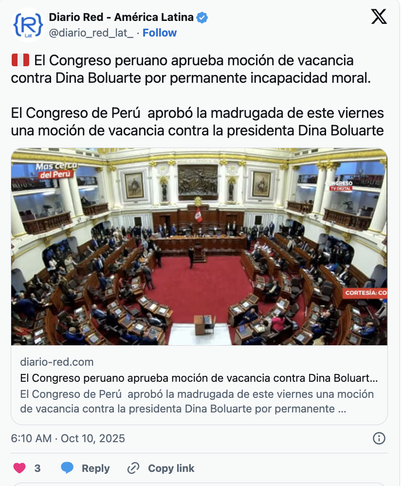 NOBOA’S MOTORCADE—Ecuadorian President Daniel Noboa’s motorcade was allegedly attacked by protesters throwing stones on Tuesday, amid nationwide unrest over rising fuel prices and creeping authoritarianism. According to the country’s environmental minister, who filed a formal complaint for “attempted assassination,” some 500 protesters targeted Noboa. Five people were arrested and set to be charged with “terrorism,” but a judge ordered their release on Wednesday. Officials also claimed that the car was targeted with gunfire, though no forensic evidence has been provided. Ecuador’s Confederation of Indigenous Nationalities (CONAIE), which is leading the strike against Noboa that began on September 22, rejected the government’s accusations, accusing the president of deliberately provoking protesters and warning of “possible false flag operations” aimed at criminalizing the movement. CONAIE defended the larger mobilizations as a response to “state neglect and structural exclusion."